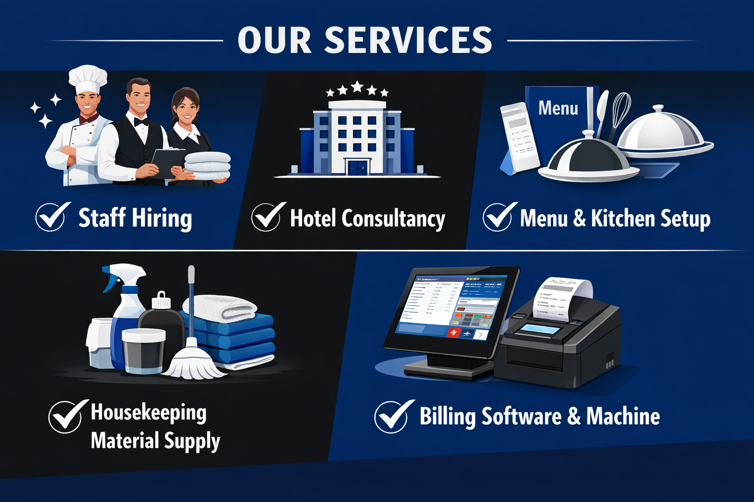 We provide complete hotel and restaurant solutions including staff hiring, consultancy, kitchen setup, housekeeping material supply, and billing software installation.
